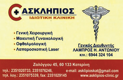Η κλινική ΑΣΚΛΗΠΙΟΣ ιδρύθηκε το 1976 στην Κατερίνη Πιερίας.